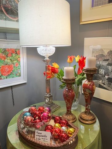 Customers found this glass table at the shop and sent us this photo with their artistic decorations under the glass top. Small furniture is very popular, so its always a challenge to keep them in stock. Do you have small pieces, such as tables, dressers, bookcases, lamps, and chairs that you no longer need? Please consider donating. Call ahead to ensure we can place it in the shop.